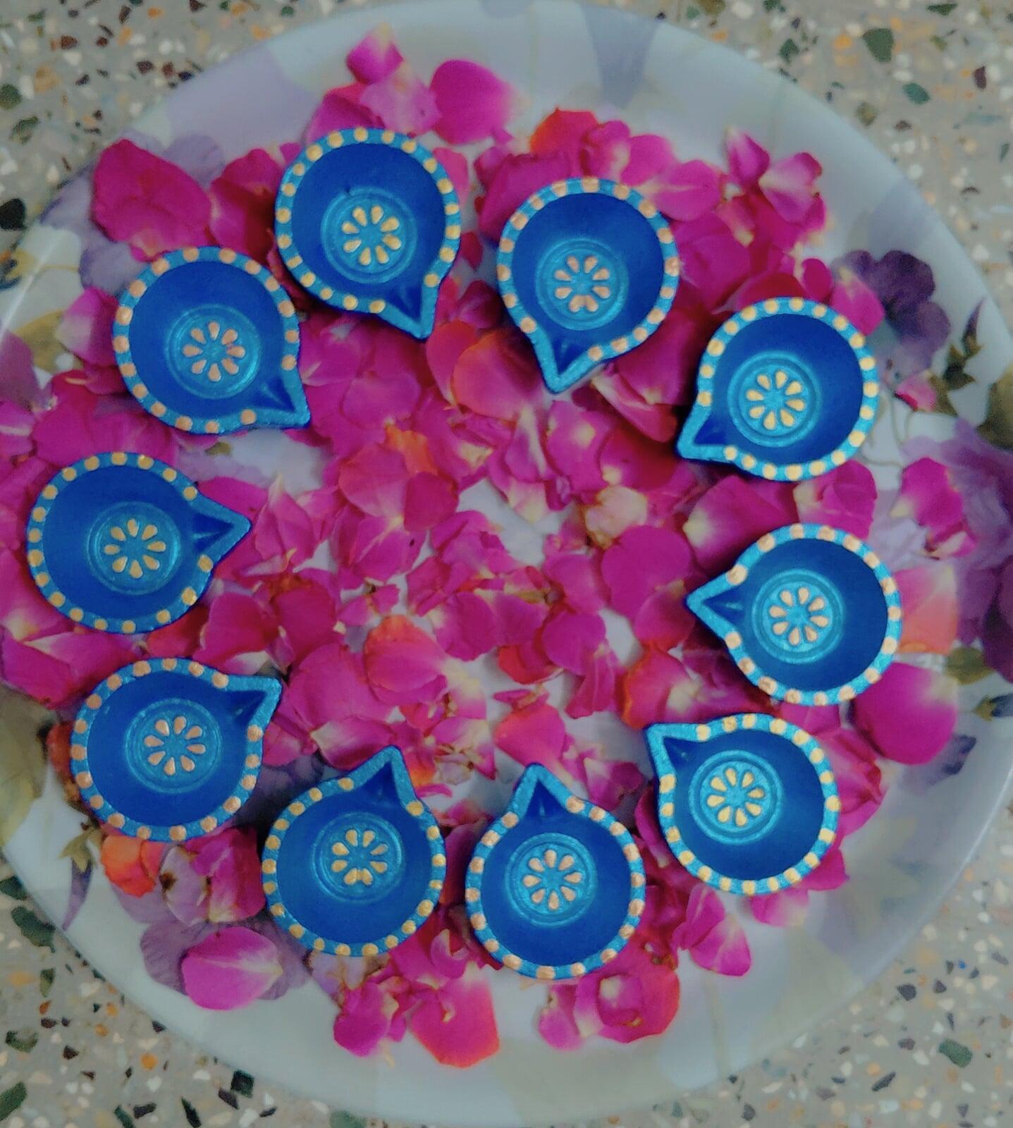 As the sun disappeared, we lit the first diya. Then the second. Soon all ten flames danced gently, their golden light reflecting on the petals like tiny stars fallen from the sky.